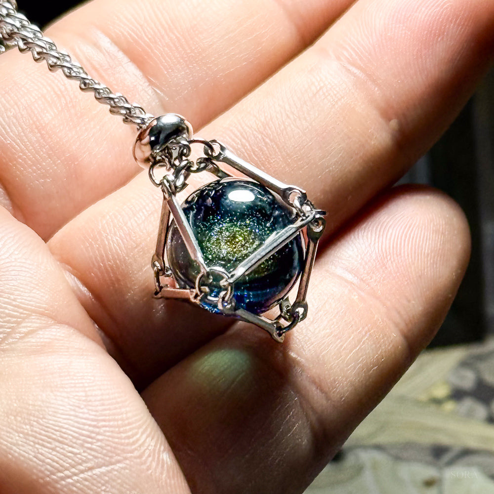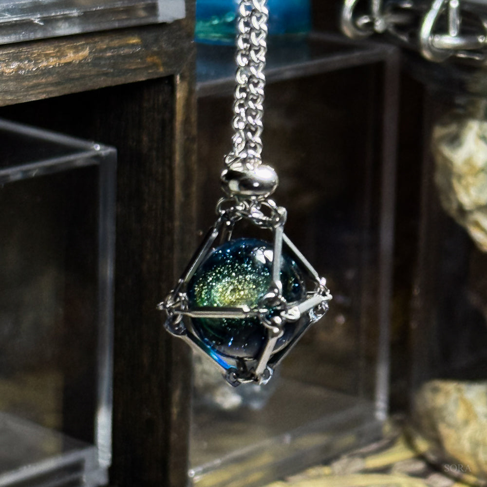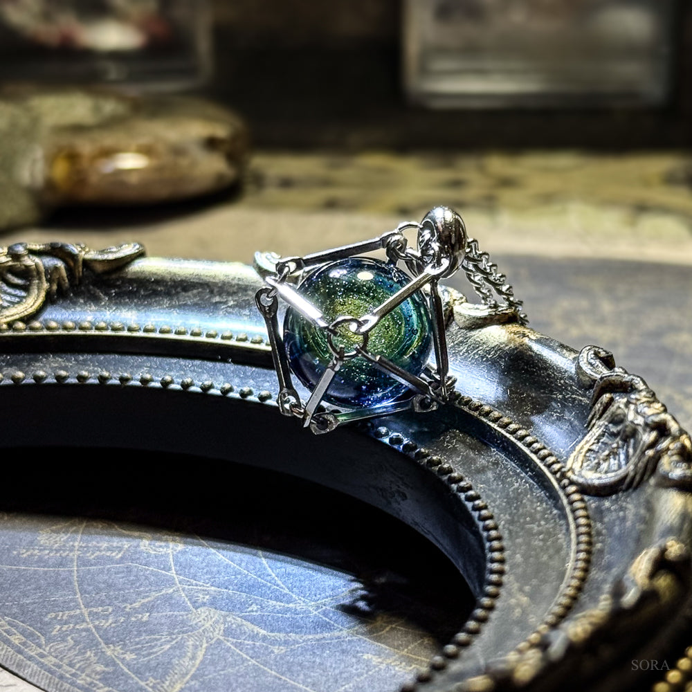 繊細な銀の籠に包まれたガラスの星は、夜空の深淵と、遥かなる銀河の記憶を映し出します。