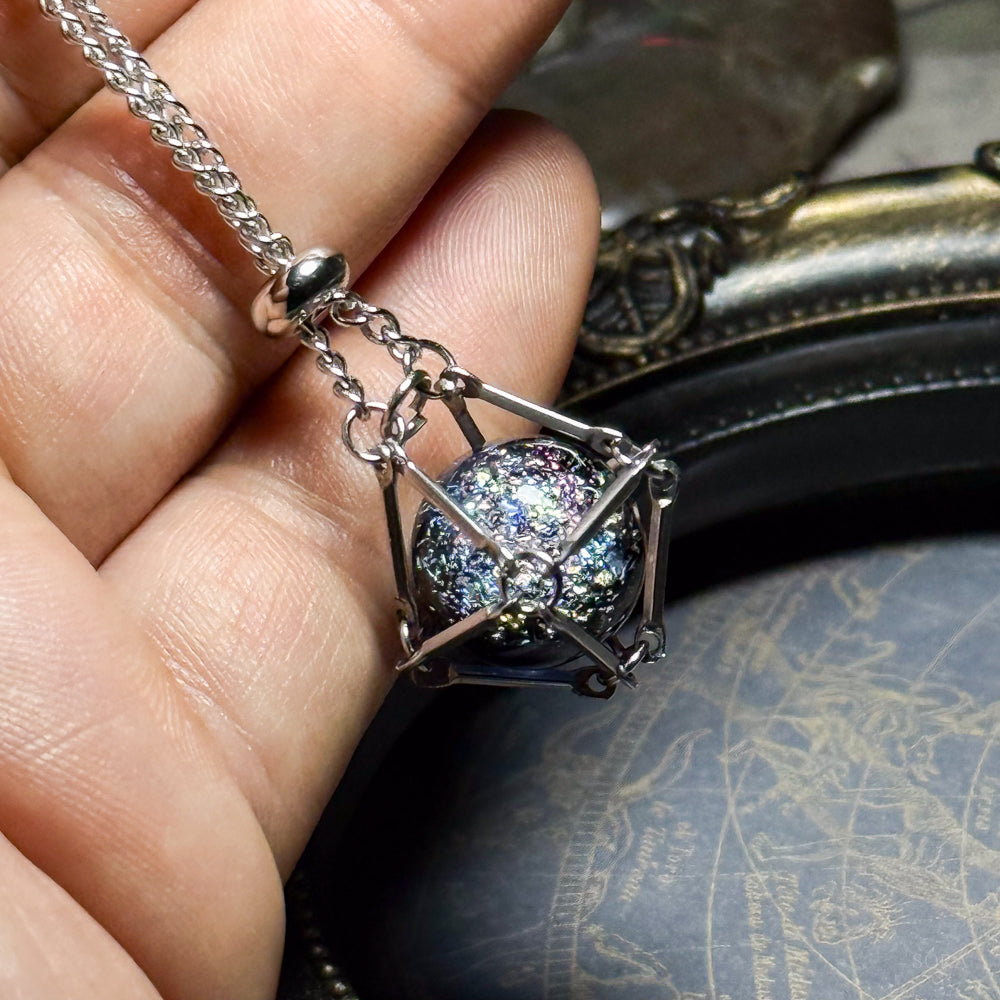 繊細な銀の籠に包まれたガラスの星は、夜空の深淵と、遥かなる銀河の記憶を映し出します。