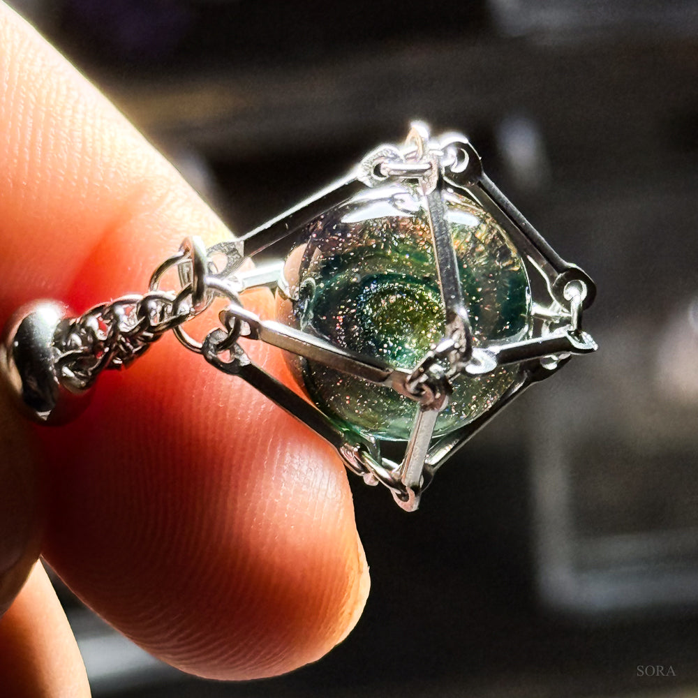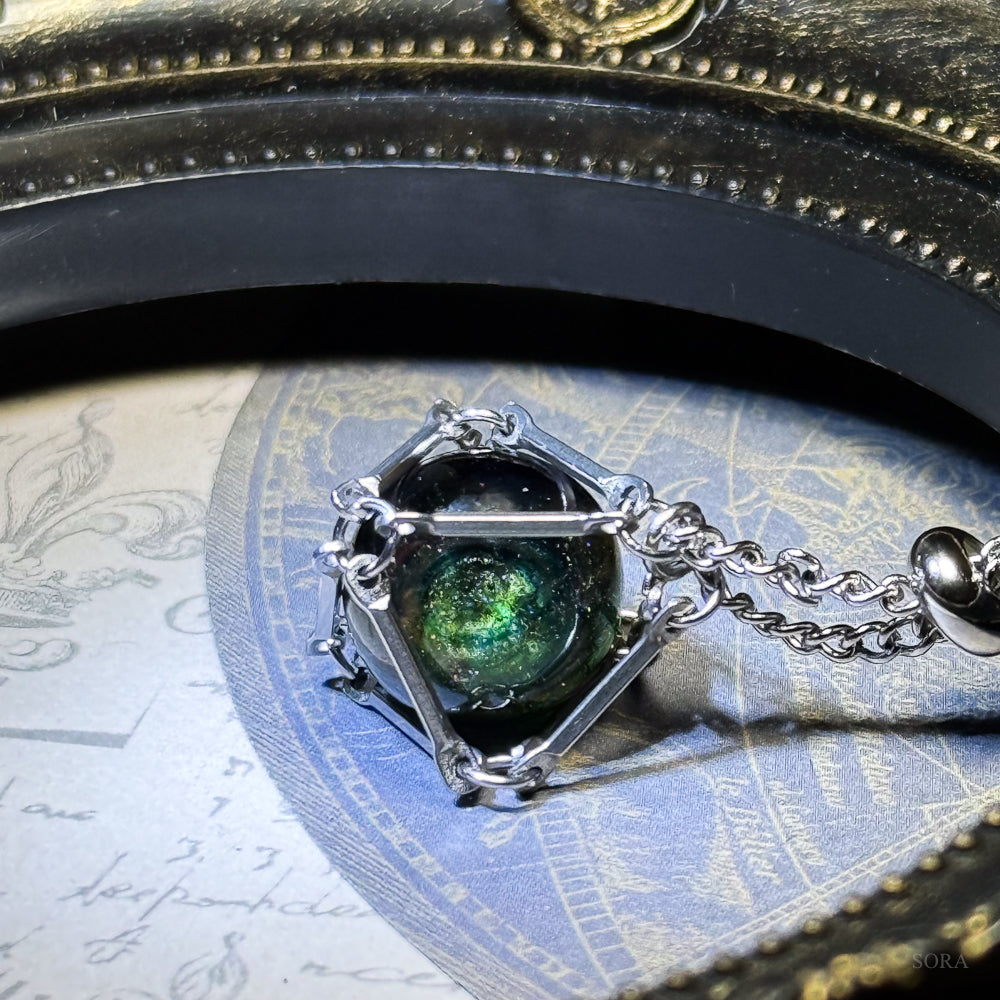 繊細な銀の籠に包まれたガラスの星は、夜空の深淵と、遥かなる銀河の記憶を映し出します。