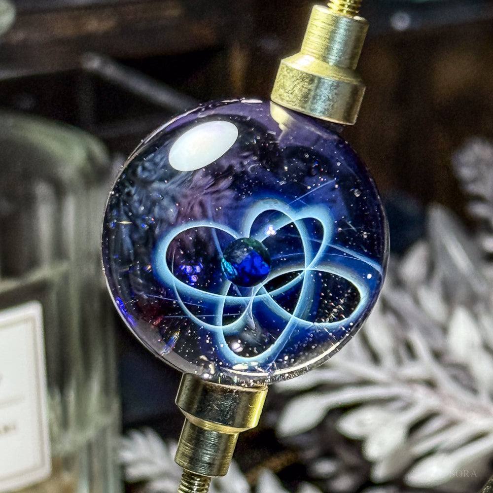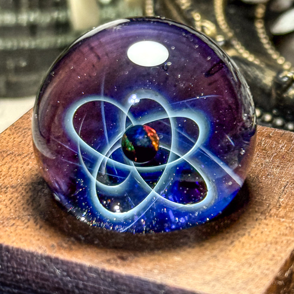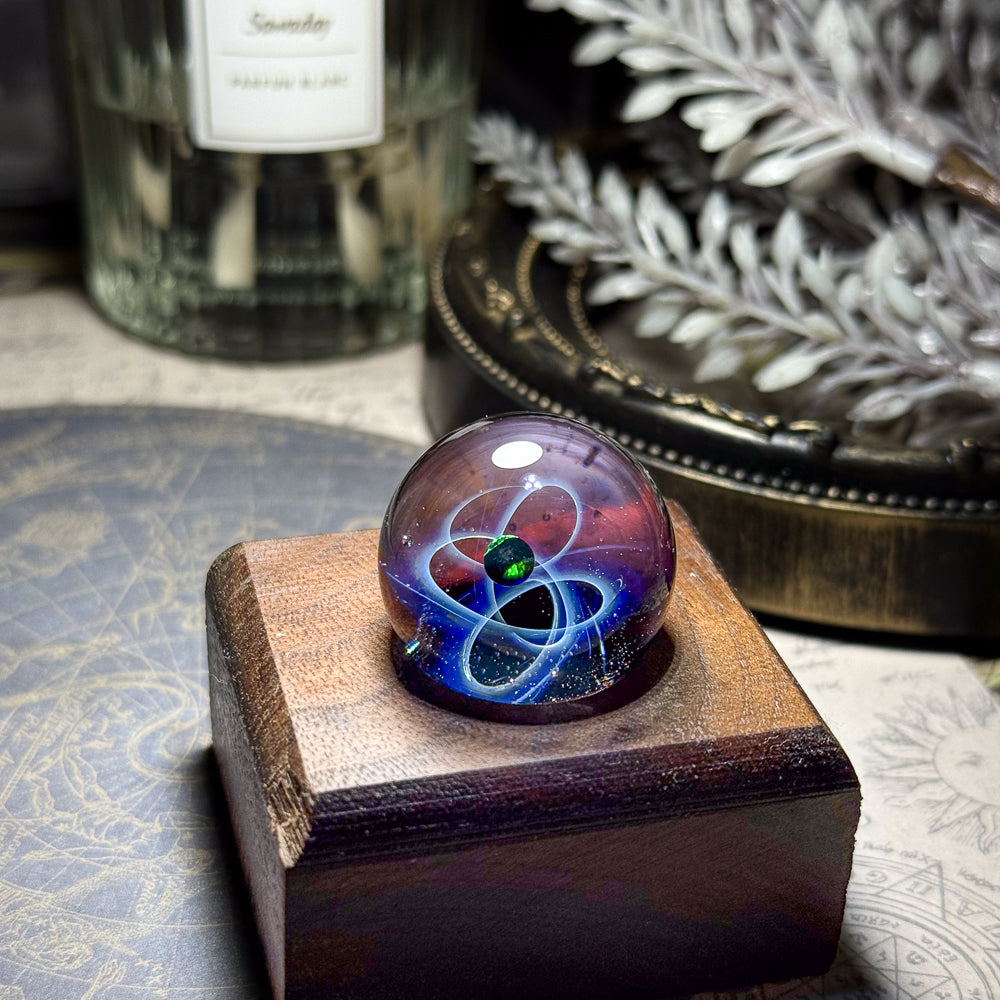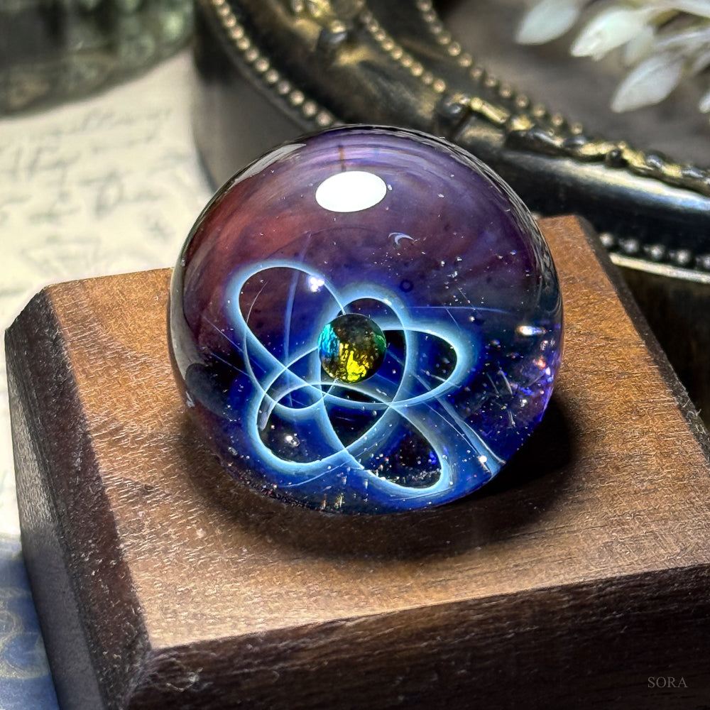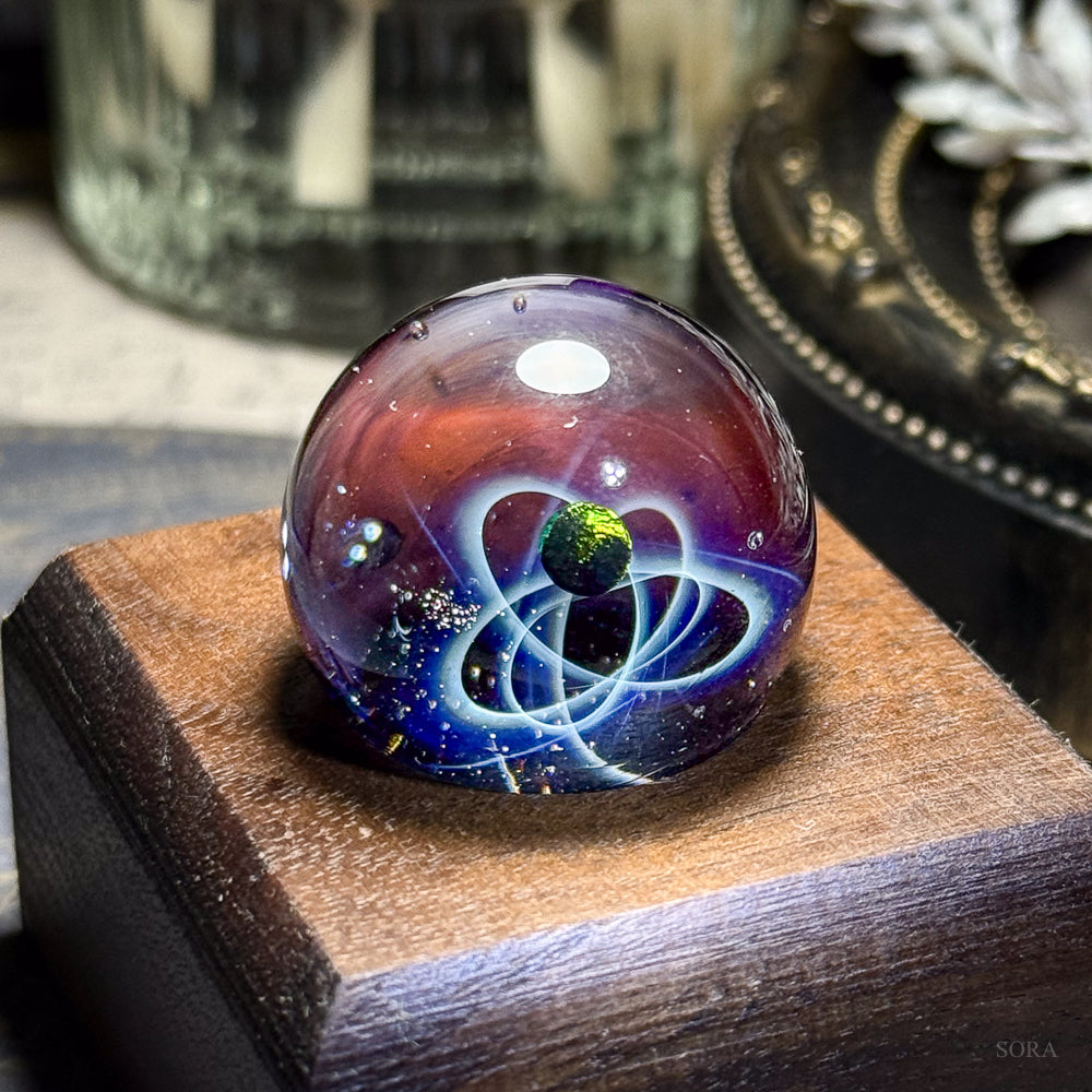 何万光年も旅する星の軌跡を描いたデザイン。永遠とも思える時間をガラスの中に感じて欲しい。 色とサイズの違うオパールの惑星を4つ使用した贅沢な作品です。台座にはこの作品は特別に花梨瘤(こぶもく)の高級感あるものをおつけします。 ストレスや忙しさで心に余裕がなくなっていませんか? あなたが宇宙に惹かれるものを感じる卓上で楽しめる観賞用の宇宙、光の当たり方で様々な表情を見せてくれる宇宙は、あなたの心の神秘や美の感覚を呼び覚まし、あなたらしさを取り戻すためのリセットタイムを与えてくれるかもしれません。