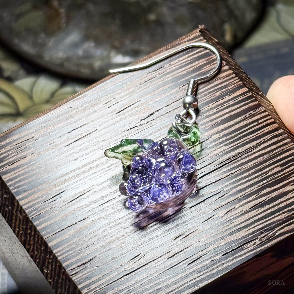 淡い紫のガラスを使ってバーナーワークで葡萄を手作りしました。秋らしいコーディネートにピッタリの作品です。片耳なので、片側だけの方にも購入いただきやすい価格になります。片耳は葡萄、片耳はお客様の持っているピアスと合わせてコーディネートする楽しみ方もおすすめ!