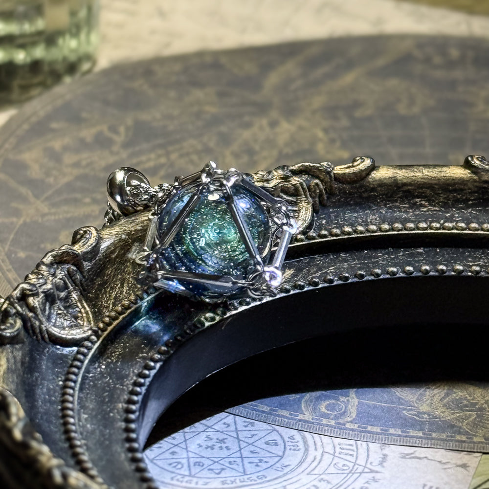 A glass star encased in a delicate silver cage reflects the depths of the night sky and memories of faraway galaxies.