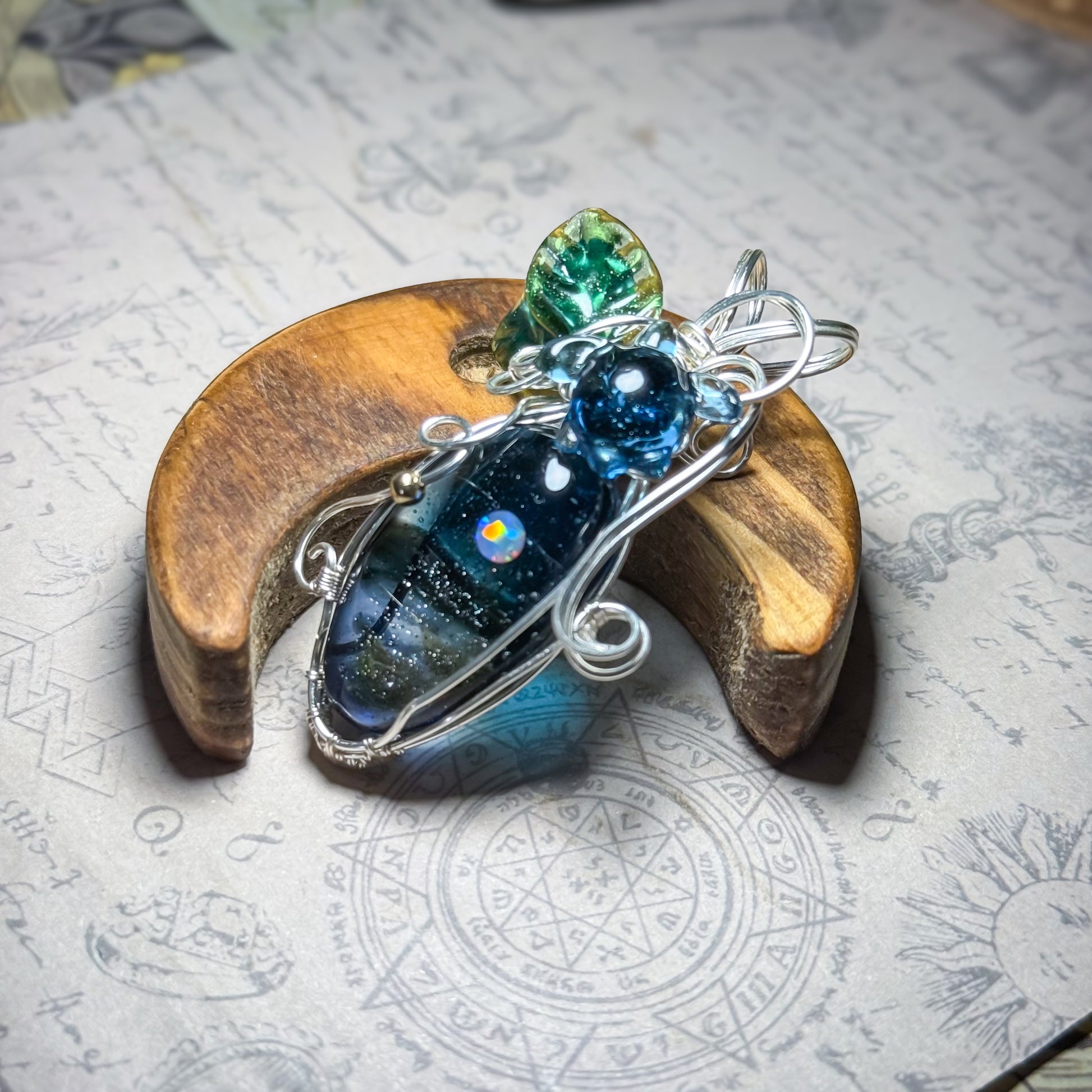 A wire-wrapped pendant that captures memories of waves and moonlight.