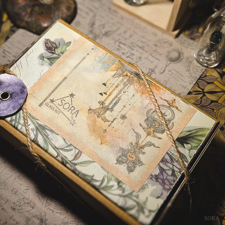 新しいギフトボックスには、アンティーク調のデザインペーパーで「時間の流れ」を、クラフト素材の箱や麻紐・ハトメで「素朴さ」や「儚さ」を表現しています。